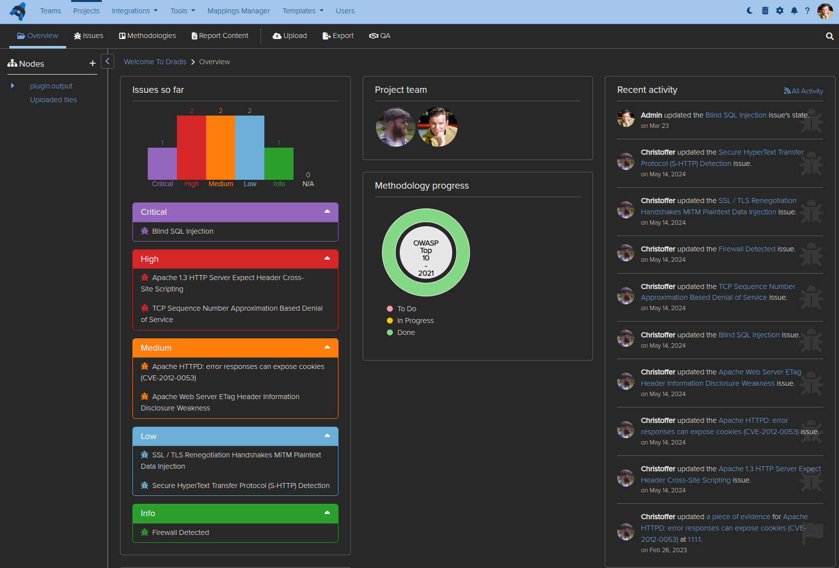 Read-only Contributor users in Dradis can now be given access to even more features and data within Dradis. The latest addition is access to Business Intelligence data for projects to which they have been assigned. For example, perhaps a project manager needs to see trends of recurring issues over multiple retests for a single client, but you have no other need to give that person a paid license seat. Simply add them as a contributor user, assign them permissions for the projects they need to look at, and they will be able to see all they need on the results portal.