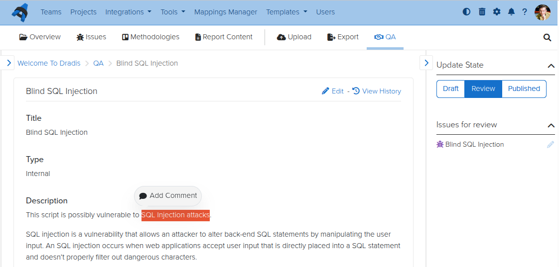 For teams using the Quality Assurance feature in Dradis, some feedback we have heard frequently is that inline comments would be helpful to discuss specific items among the reviewer and tester(s). Now you can do so, with the QA inline comment feature. No more hunting through comment sections for relevant discussions – go line by line and open threads as necessary.