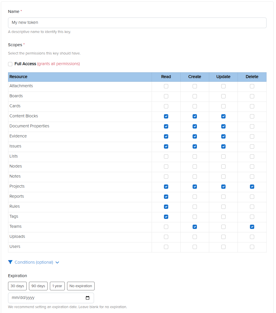 We reworked API keys so that you can now have scoped Personal Access Tokens (PATs). Instead of using keys that belong to one user but have that user’s access across the board, you can now have a scoped PAT with limited, granular, specific access. Create tokens at will for your API integrations, giving Create, Read, Update, and/or Delete permissions to each individual content type in Dradis. Set expiry dates and conditionals if you like, and create as many as you would need.