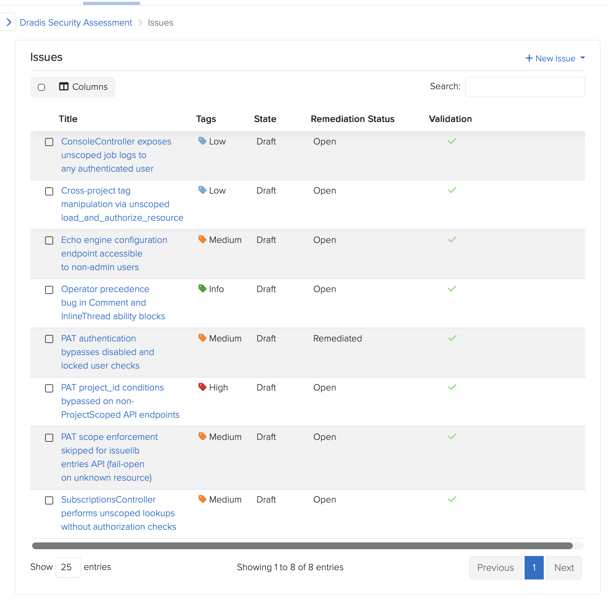 This is the part that still feels absurd when you say it out loud. The OWASP Top 10 2025 kit we were about to ship in Dradis 5.0, the methodology, the sample project, and the three report templates, were used to run and document the audit on the codebase that was about to ship them. The reporting tool reported on its own vulnerabilities, using its own brand-new methodology content, while the release that introduced that content waited for the audit to finish.