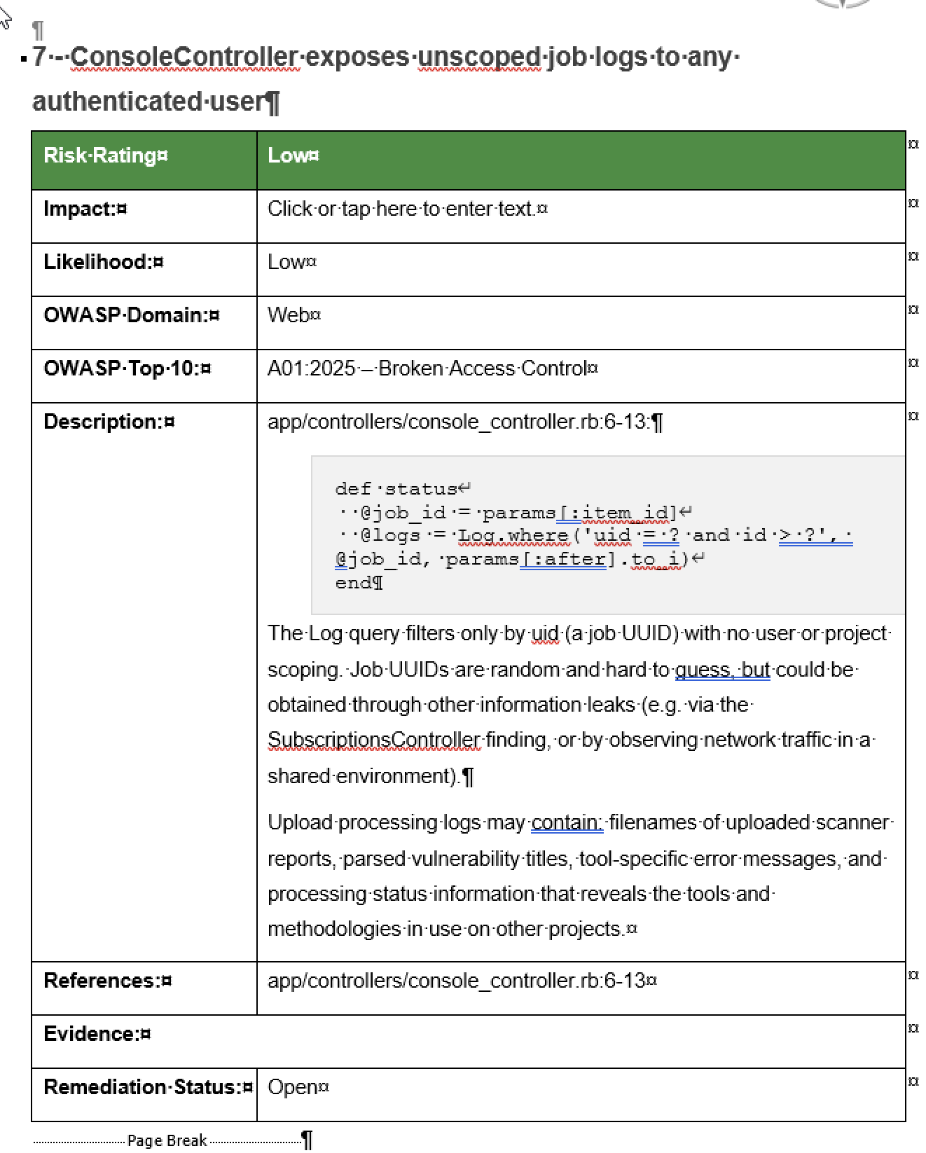 Finding 7 (console logs not scoped per user) was accepted as capability-token design after analysis. The reasoning is documented in the code itself at dradis-ce#1564. The summary: the job UUID is server-generated, random, only returned to the initiating user, and treated as the read capability for the associated logs. Adding row-level scoping would have required a migration and threading user context through 25+ call sites across core and every upload plugin. The cost was not proportionate to the residual risk, and the design intent is now recorded, where a future maintainer will see it. These logs are also garbage-collected daily.