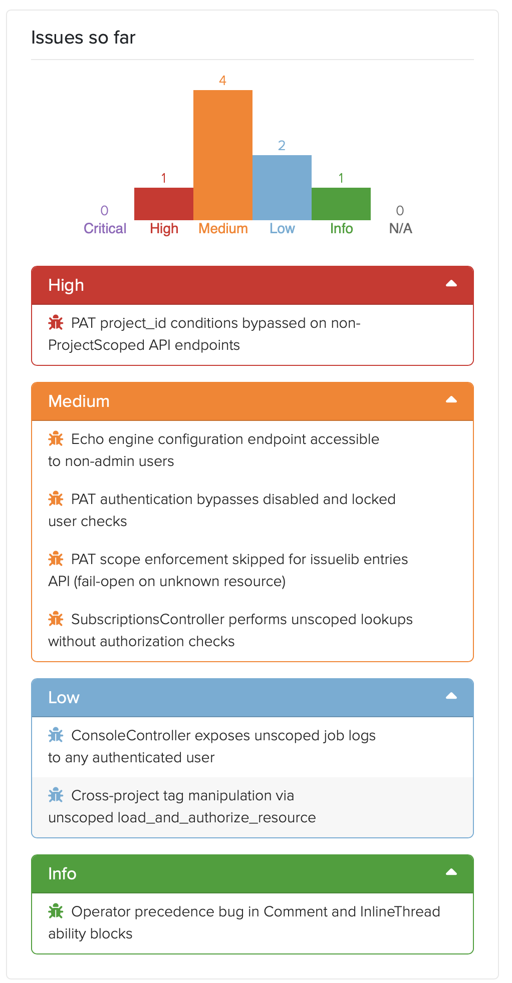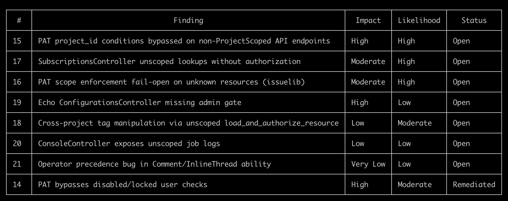 One of the PRs in the audit received an automated review from a separate agent. The review flagged a real edge case in the fix: an empty allowlist in a personal access token’s project conditions passed the present? check as false, so the token’s index endpoint still worked, while every member action returned 403. Incoherent behavior. The review caught it, the fix was tightened to use Hash#key? instead of present?, two regression tests were added, 27 examples continued to pass, and the PR merged cleaner than it started.